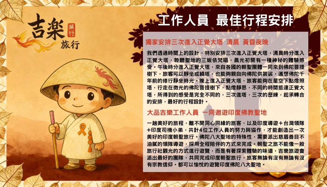 1. 吉樂專業團隊設計下,原創獨家的的朝聖行程,自由度及探索度高,非一般觀光團照表操課。