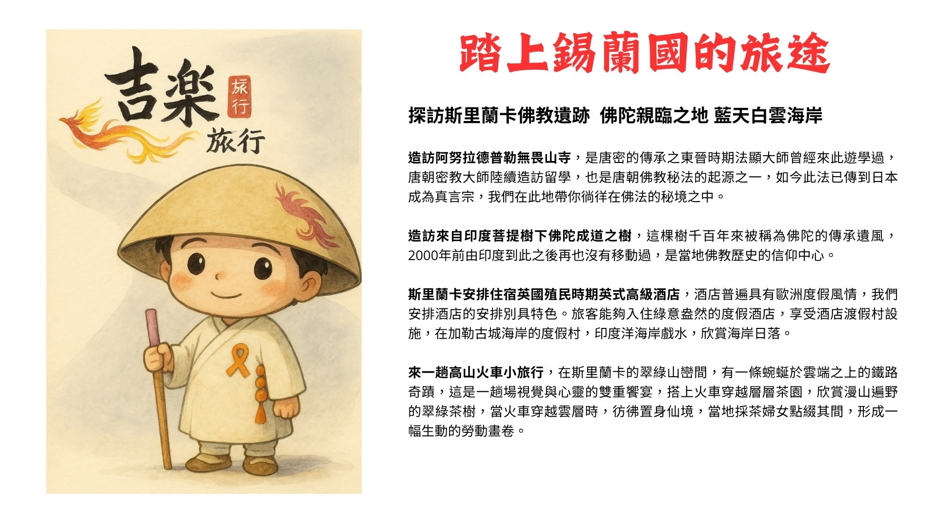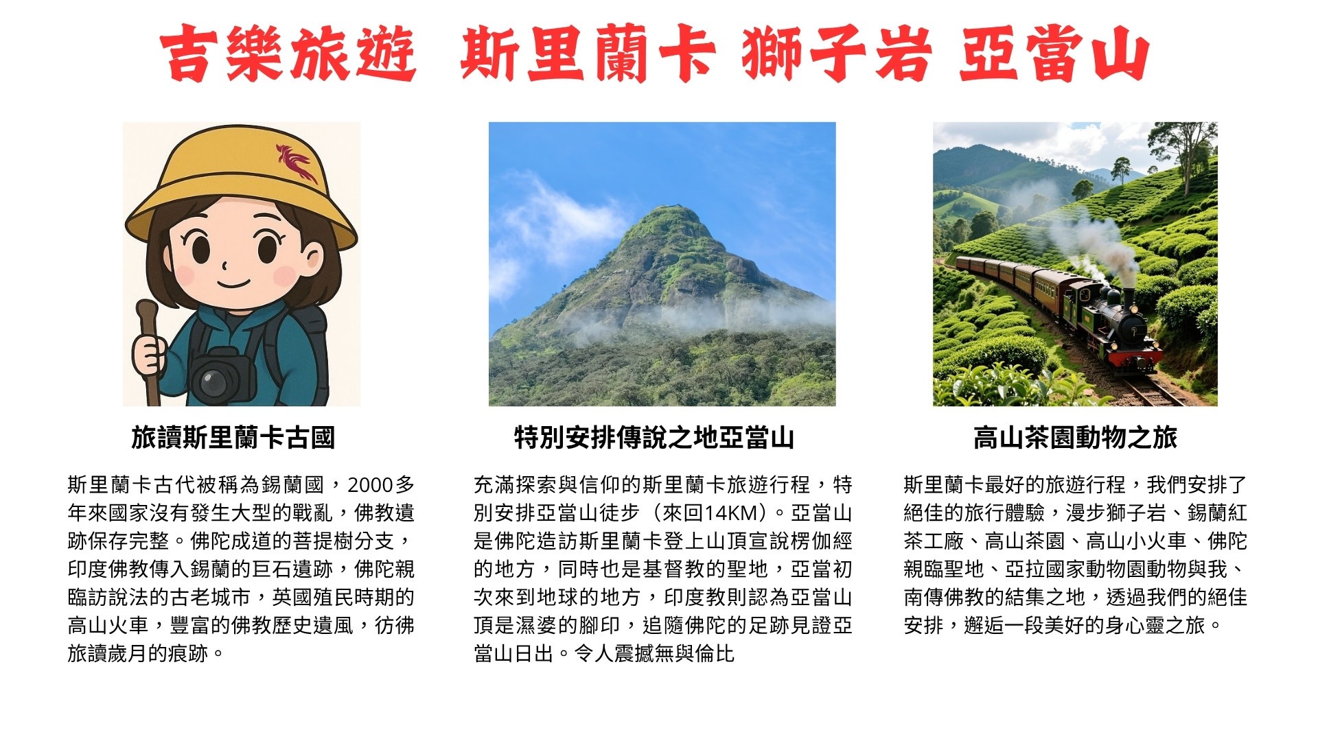 1. 行程表所列:餐食/酒店/車資/門票/簽證/斯里蘭卡來回機票、機場稅、燃料費。