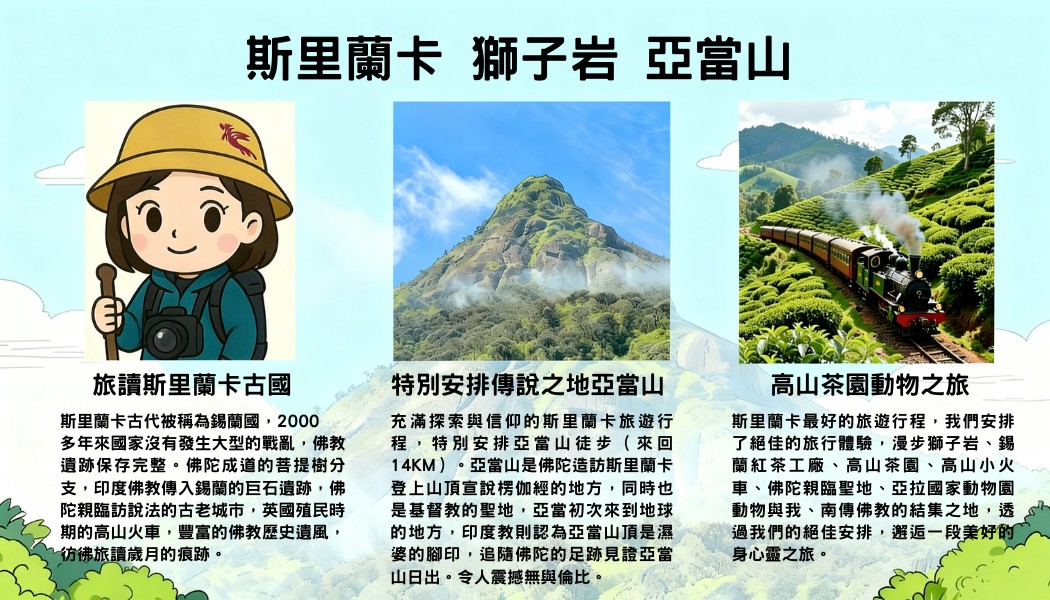 酒店早餐後,參觀斯里蘭卡【高山茶園】位於中南部山區,海拔 1868 公尺的努沃勒埃利耶,是斯里蘭卡海拔最高的區域,也是錫蘭紅茶的主要產地。因為留下了許多英國殖民時期的建築,這裡也被譽為「小英格蘭」。錫蘭紅茶是對出產於斯里蘭卡的紅茶的統稱,又稱為「西冷紅茶」、「惜冷紅茶」;錫蘭高地茶主要有烏龍茶(或烏巴茶)、汀布拉茶和努沃勒埃利耶茶。【亞當峰Adam's Peak】又名聖足山,位於斯裡蘭卡中南部,距可倫坡約四十公里,海拔二千二百四十三公尺,是斯裡蘭卡南部最高的山峰並擁有聖山的美譽。佛教、印度教、伊斯蘭教、天主教、基督教徒均視此山為朝拜之。亞當峰是獨立的一座山峰,山頂上有個腳印,有人說是佛陀留下的、有人說是濕婆神留下的、也有人說是耶穌的弟子亞當留下的,這就是亞當峰被稱為聖山的原因。另據斯裡蘭卡《大史》所載,佛陀住世時曾三到楞伽島。第一次到該島中部的摩黑央格那,調伏了那裡的夜叉,第二次到該國西北部的龍島,調解為寶椅而發動戰爭的兩派人;第三次佛陀攜同五百弟子到達凱拉尼亞和須摩納山。據說佛陀曾「一足躡王城北,一足躡山頂。」(見法顯《佛國記》)在山頂上留下了一個甚大的佛足印跡,朝拜聖足山也便成為國內外佛教徒重要的佛事活動。